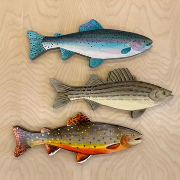 Abby's fish are decorative, whimsical, and biologically accurate. Working in her father's Brunswick woodshop, Abby selects a species and fires up the scroll saw, reproducing each dorsal and every caudal. "I had no idea until I began how many trout species there are, even here in the U.S.. Most of them are gorgeous!" Of course,