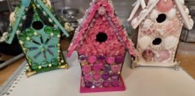 Create a decorative wooden birdhouse with choices of brilliant cut stained-glass, colorful paints, green moss, and glass beads.
